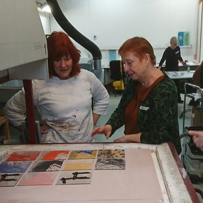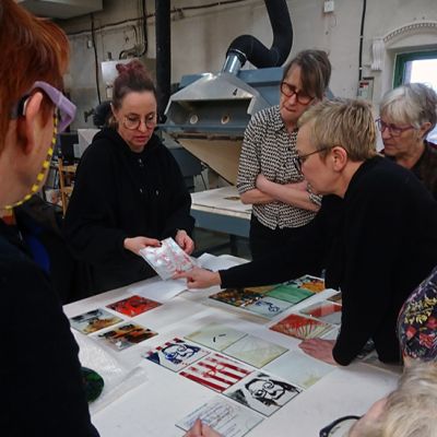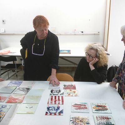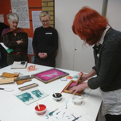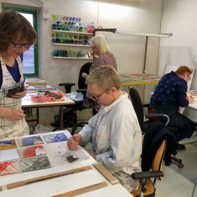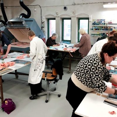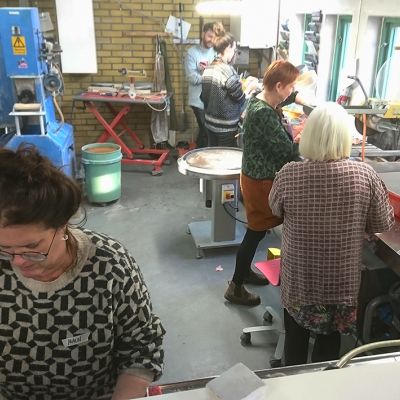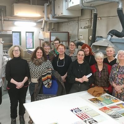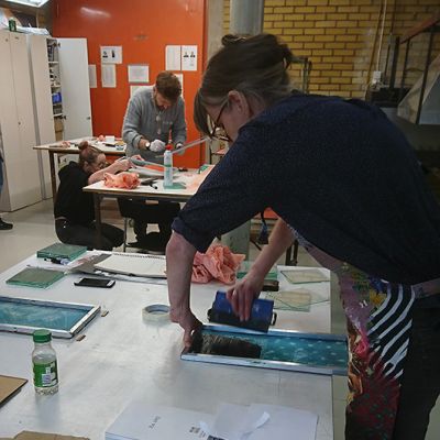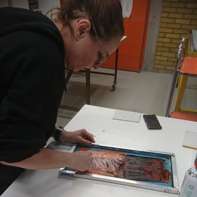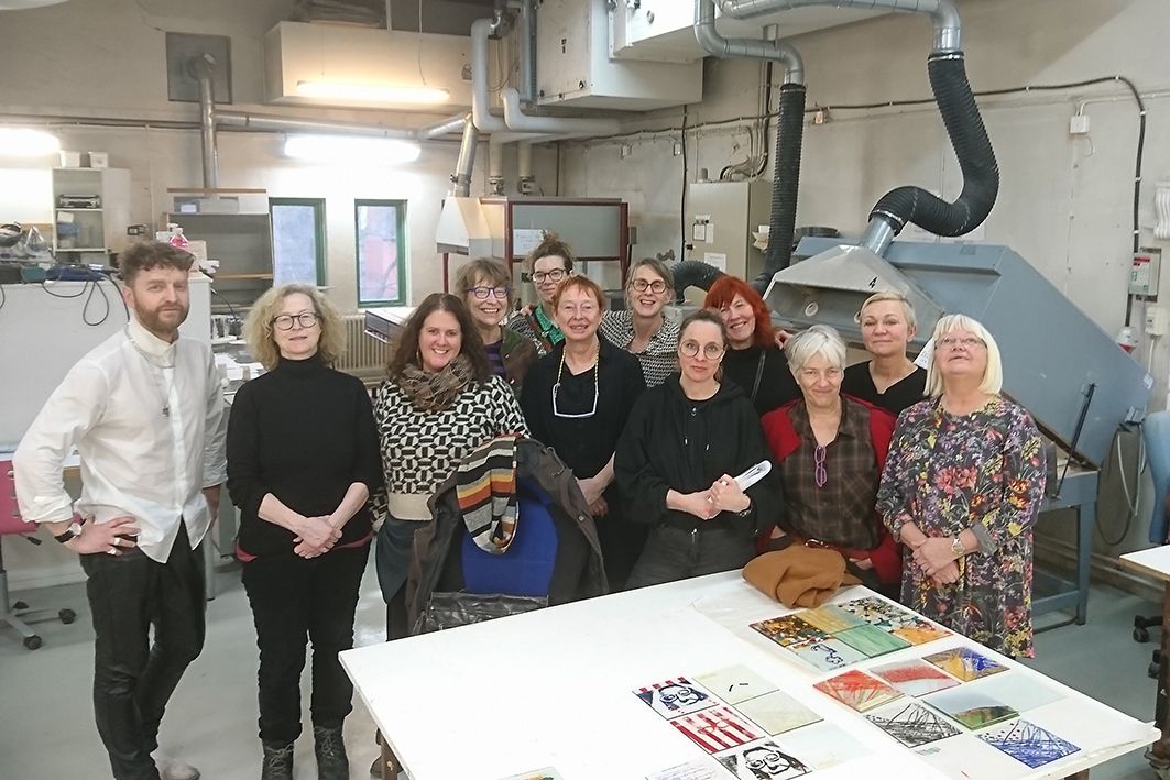 Den 27-29 januari hade vi en intensiv och rolig workshop-helg på glasavdelningen på KKV i Göteborg. Deltagarna kom från Umeå i norr till Skåne i söder. Fokus låg på screentryck på planglas. Deltagarna gjorde egna screenramar som de sedan experimenterade med och testade olika typer av färger och även provade att fusa ihop.