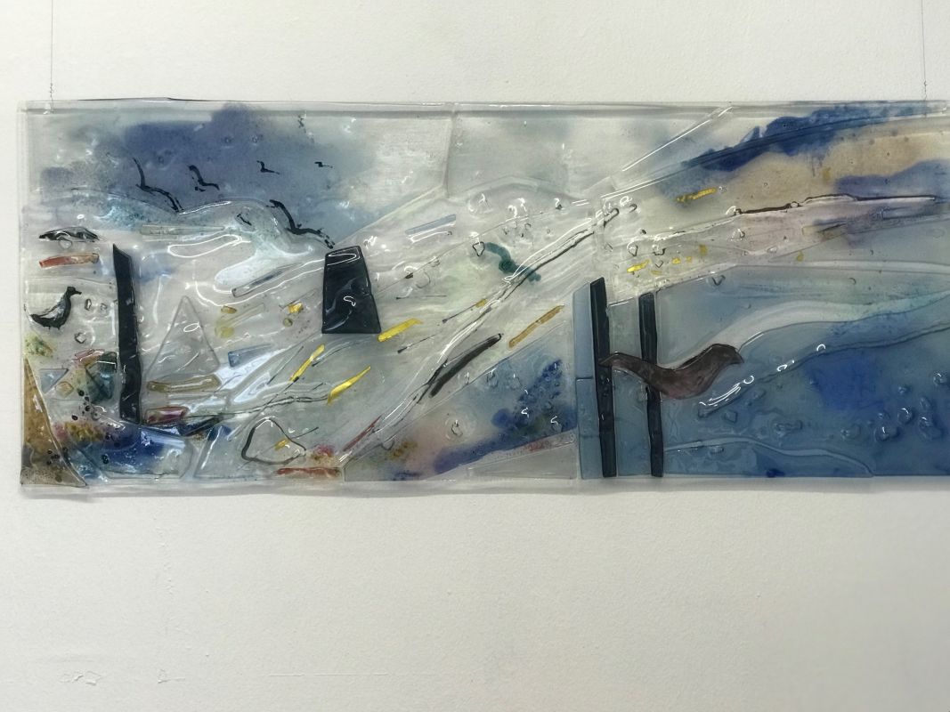 Glasbilder i fusingteknik för fyra fönster mellan korridor och skolmatsal på Varlaskolan Kungsbacka.