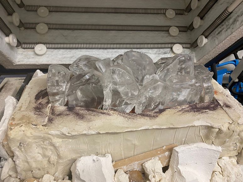 Man börjar med att tillverka en modell ett ”original”av t ex lera, trä eller vax. Originalet gjuts in I en form av gips och kvarts. Om det är av vax bränner man sedan ut vaxet så att ett hålrum finns i gips-kvartsformen. Man placerar formen i våg i en glasugn och fyller formen med kalla bitar eller kross av kristallglas, planglas eller flaskor. Därefter låter man glaset smälta ned i formen inne i ugnen som man programmerar enligt en speciell temperaturkurva. När glaset svalnat till 25 gr celsius kan man öppna ugnen och ta ut glasobjektet medan formen rivs och är en sk ”förlorad form” liknande hur man gjuter tex brons. Glaset kan sedan slipas, sågas och poleras mm till önskat utseende.