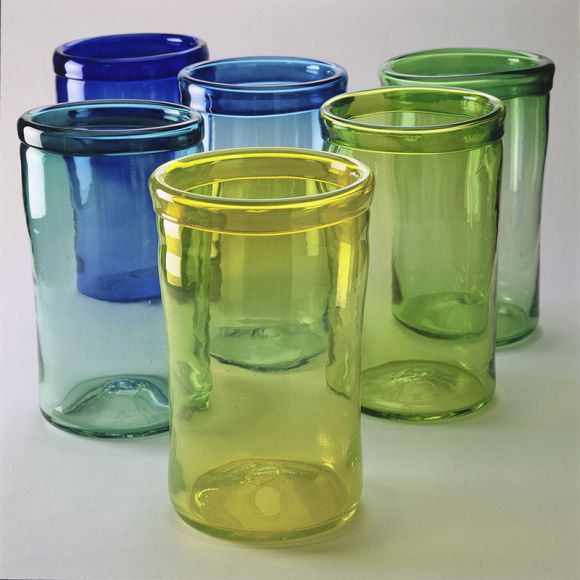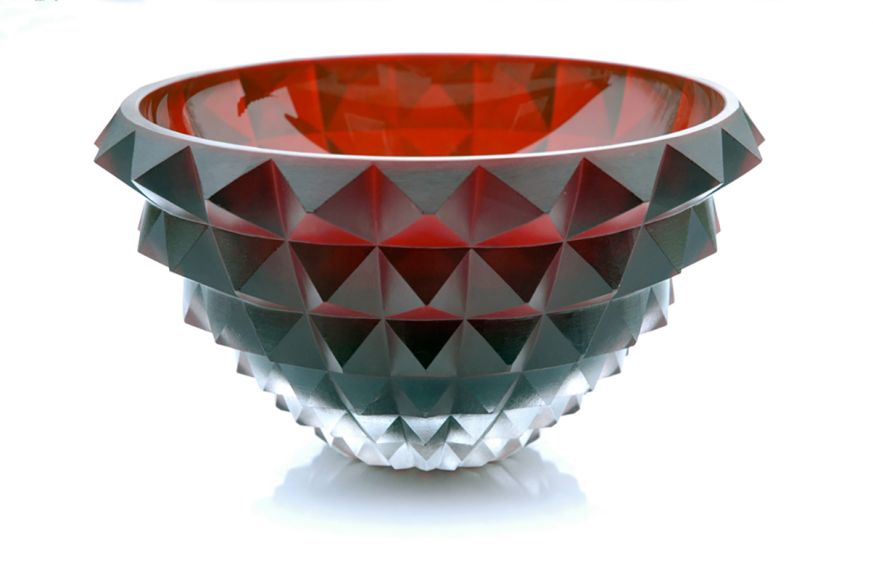 Underfångsglas. Glasblåsaren blåser in luft i en liten kula av färgat glas, sk tappfärg. Utanpå läggs ett skikt av klar glasmassa. Därefter blåses glaset upp till önskad form. Färgen ligger på insidan av glaset. Det går också att lägga på ytterligare ett färgskikt men då får man fram ett överfångsglas.